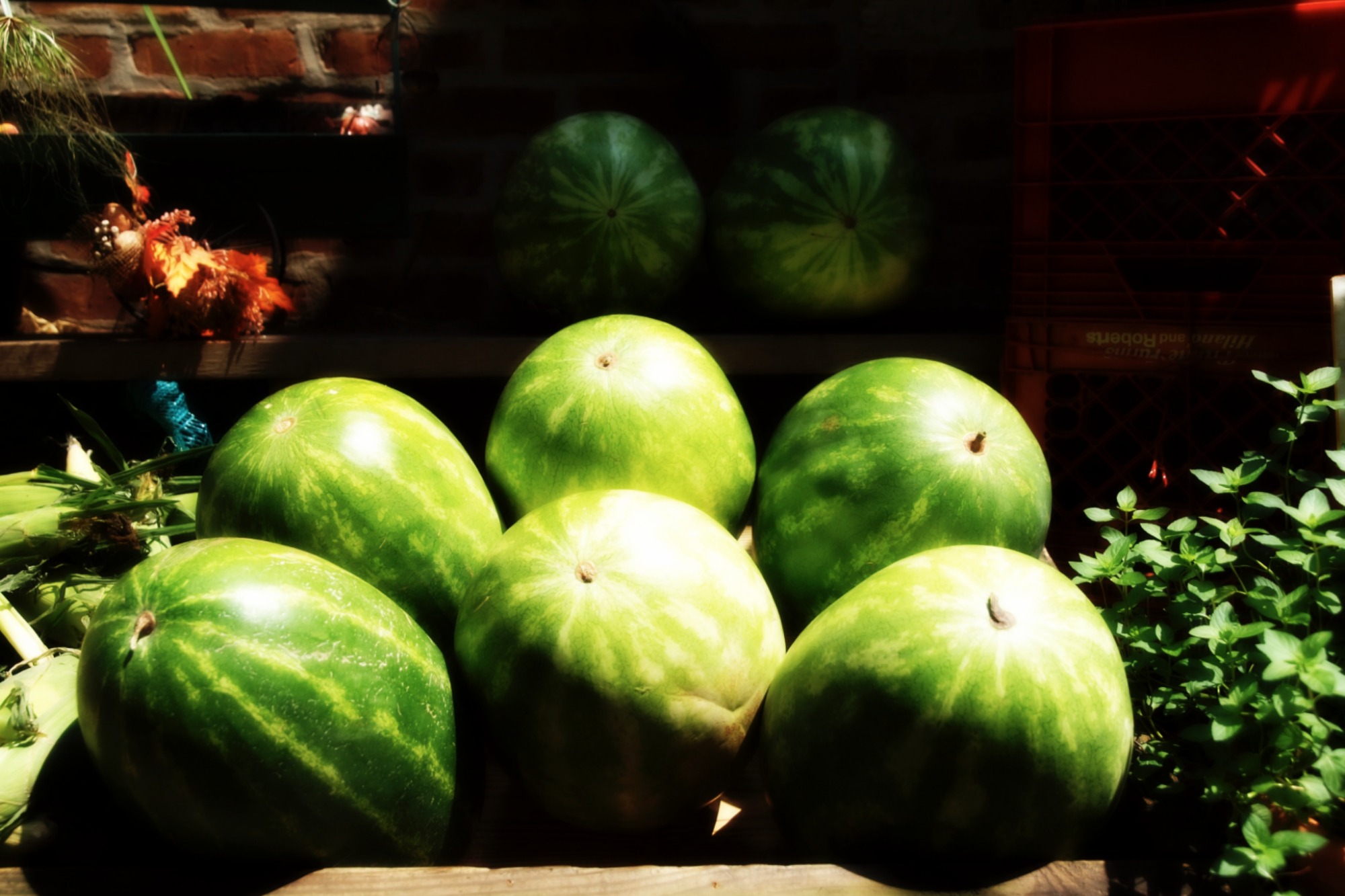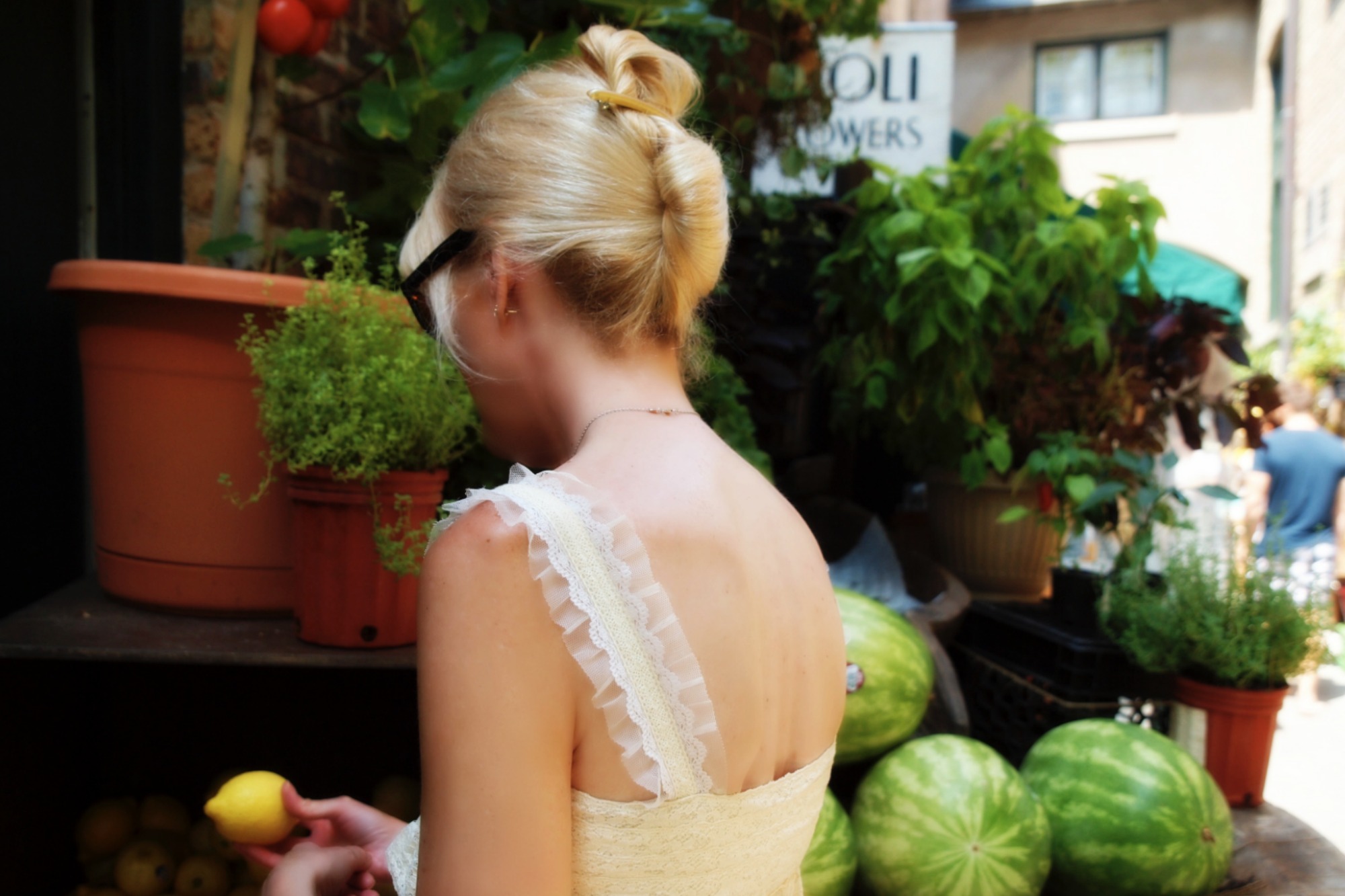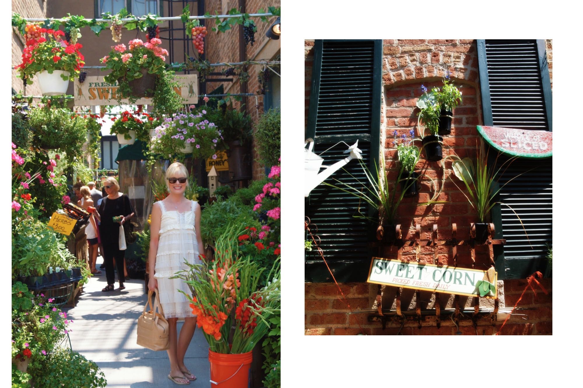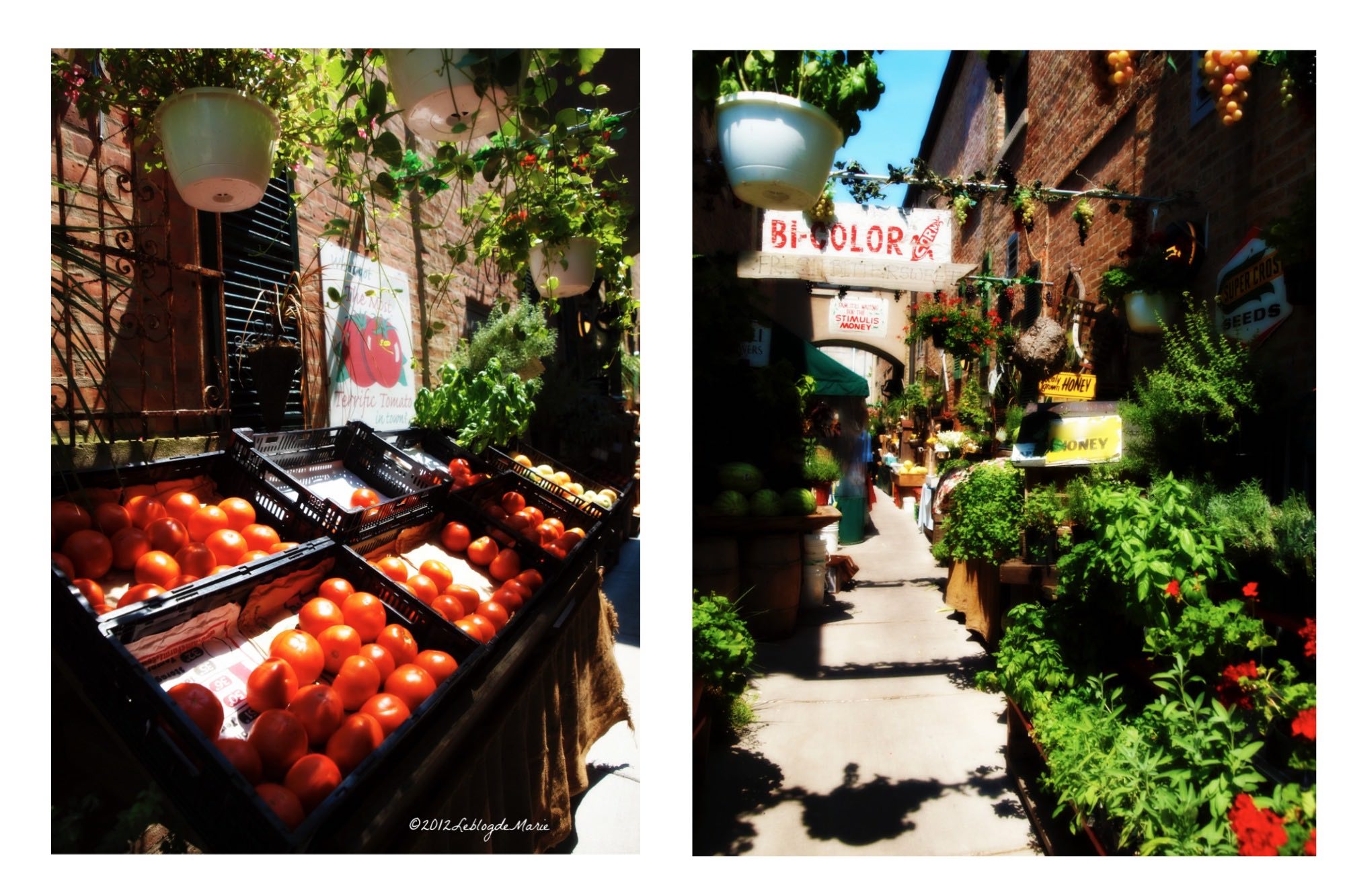 A gorgeous array of fresh flowers, and colorful fruits, and vegetables, are artfully placed on and along the brick facade walls that line this old-world alleyway. Its European charm reminds us both of our travels through France and the many outdoor markets we frequented and loved.