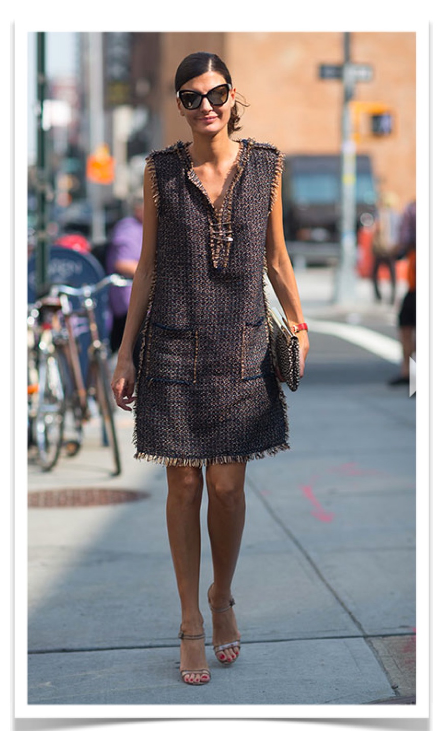 What I admire most about Giovanna, is her exacting eye and her flair for choosing an amazing array of fabrics, patterns, and silhouettes. She’s not afraid to play with color or texture.  I love the tweed bouclé shift dress above. It’s chic simplicity at its best.