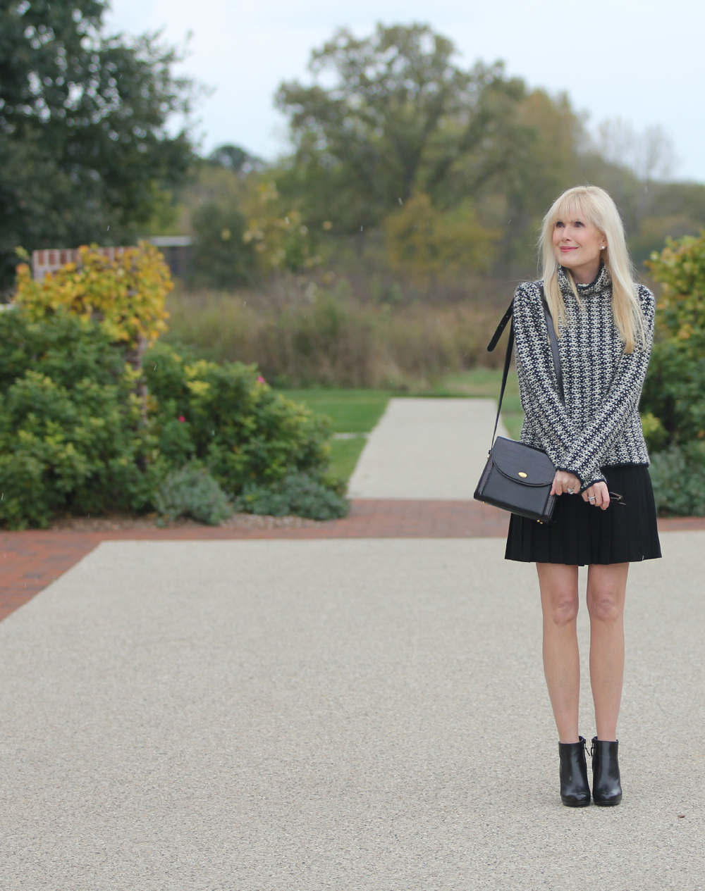 Lucky for me I had the right sweater on—a thick, textured knit that kept me toasty warm (well, at least the top of me, anyway). I paired it with a classic black wool pleated skirt and my new favorite acquisition, black leather booties. I have been searching forever for a pair, which has been no easy task because I have really narrow feet. I actually lost count of how many styles I ended up trying on before I found these. I have to stress that I am not compensated for mentioning brands, but these Stuart Weitzman booties are so comfortable that I will likely be wearing them a lot this season.