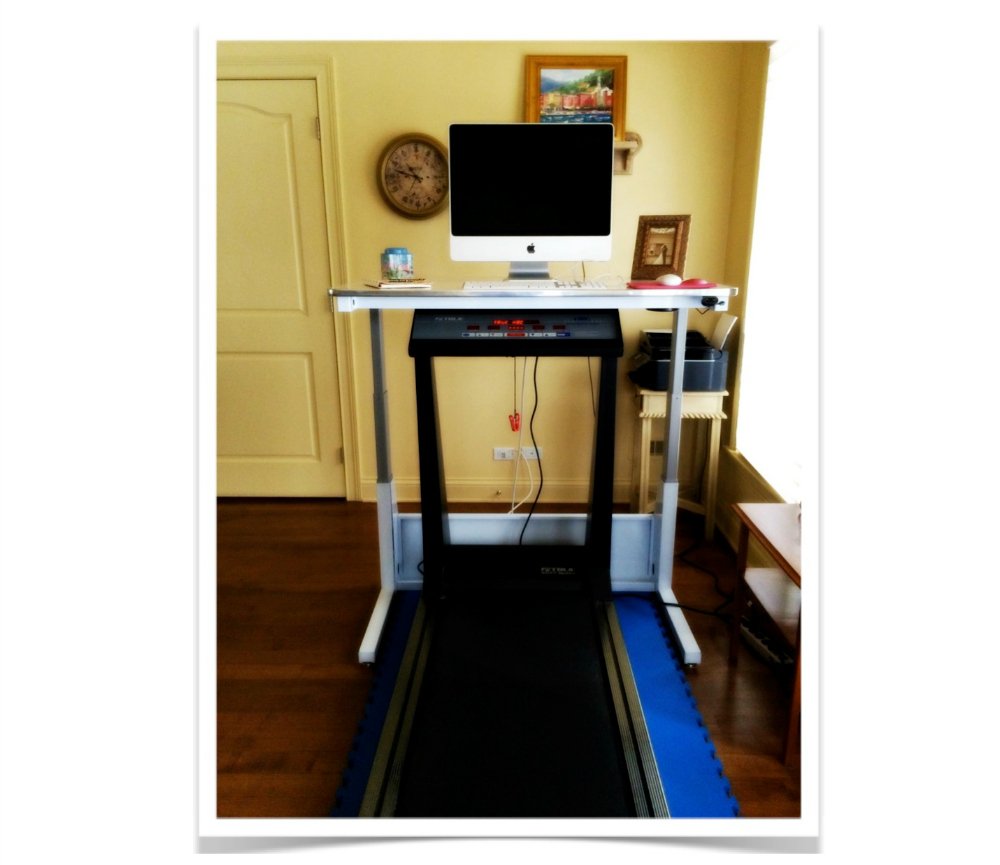 Another option, if you work from home, as I do, is to invest in a standing desk. Mine arrived recently and I decided to set it up in our gym. That may sound strange until you see where I’ve put it—directly over my treadmill.