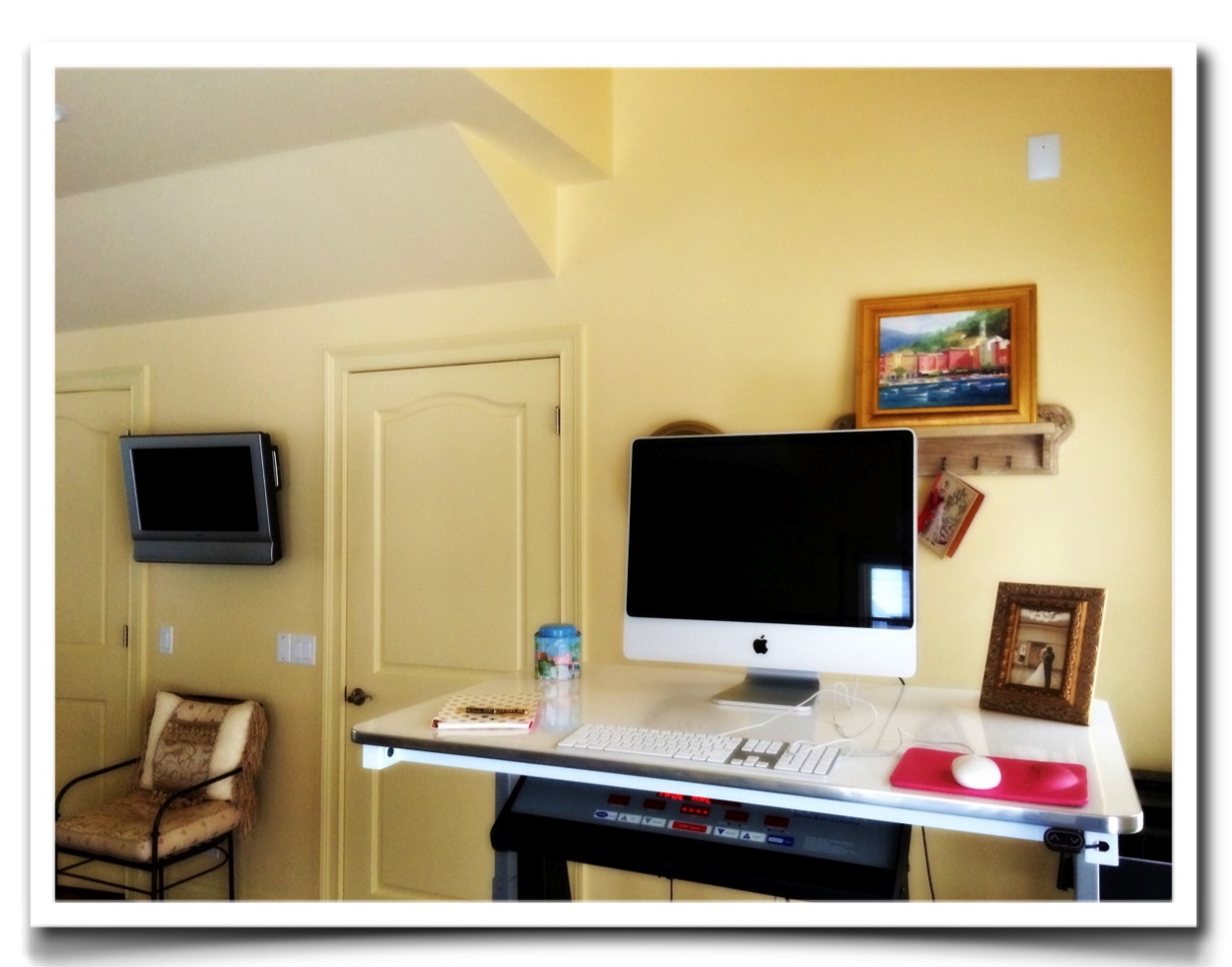 It’s by no means glamorous and everything is still pretty much of a mess (cords hanging, bare walls,etc.) but I wanted you to see the basic set-up. I decided to position my desk over the treadmill after reading reviews from others who said they felt more energized and creative while walking at their desk. More energy and creativity? I’ll keep you posted on that but if nothing else I’m really hopeful that I’ve found a whole new way to work. It’s definitely a cool concept and so far the walking while typing is working out great!