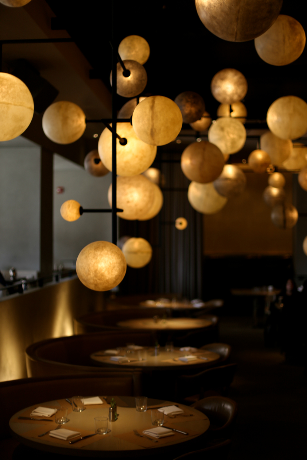 this one is made up of dimly-lit golden-hued globes that ironically cast just enough of a warm glow to make anyone dining here look like a celebrity.