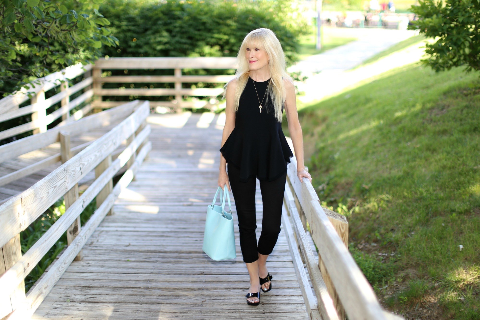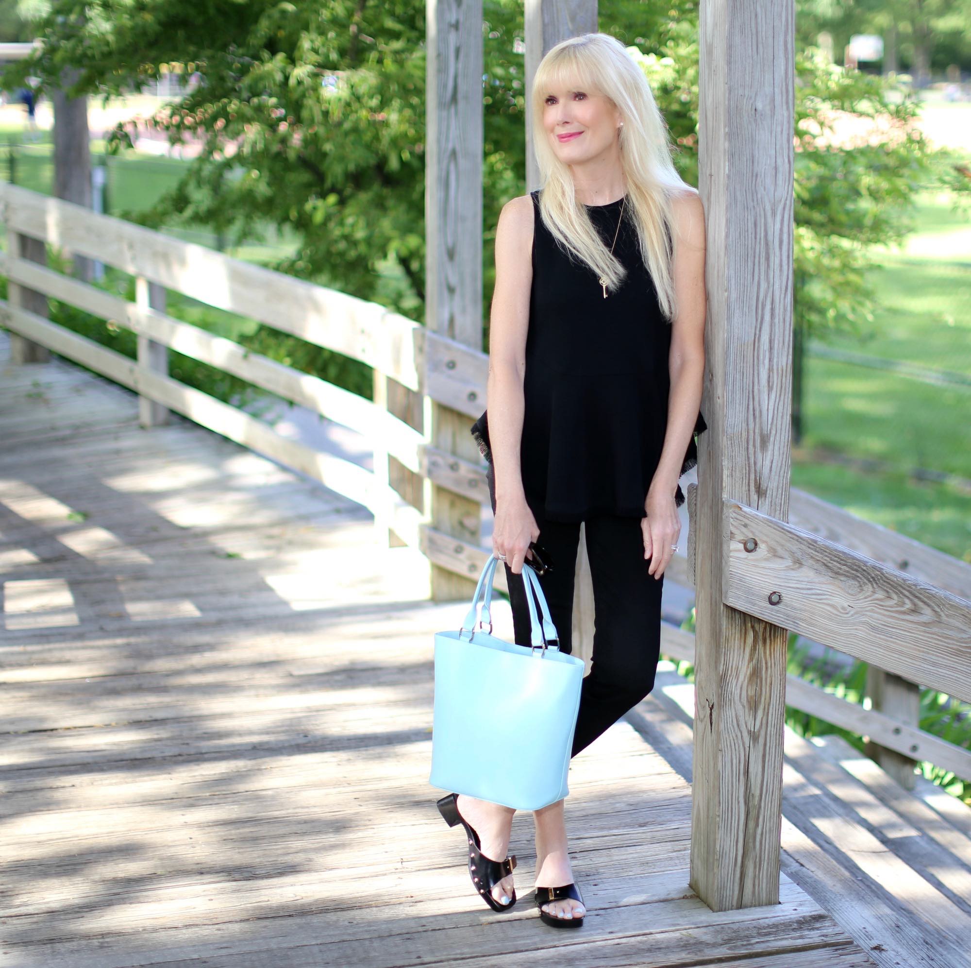 It’s always nice to add an unexpected pop of color to a nearly monochromatic look and the addition of my light blue Longchamp bag  and nails by Eve Snow fit the bill perfectly.