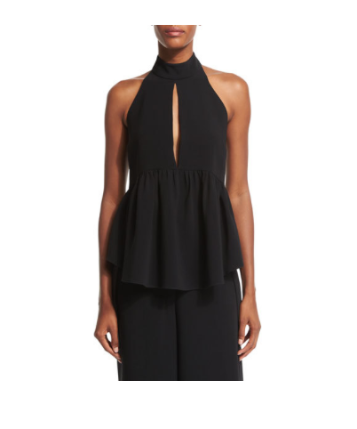 The unique details of an Elizabeth and James exaggerated peplum top with frayed hem paired with J.Crew’s sleek, cropped jeans are visually interesting and provide the perfect counterbalance.