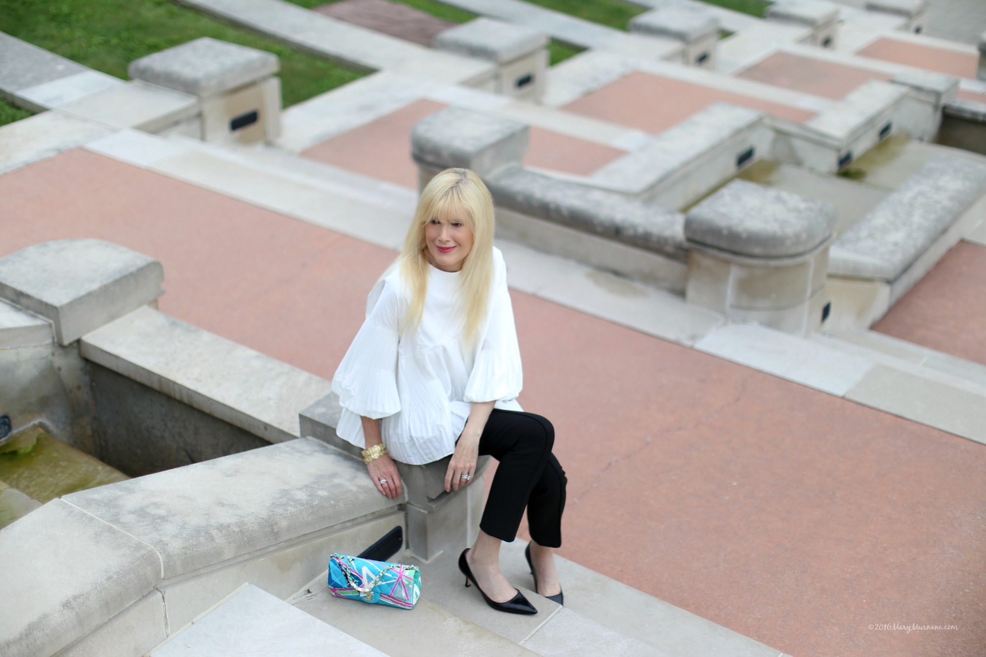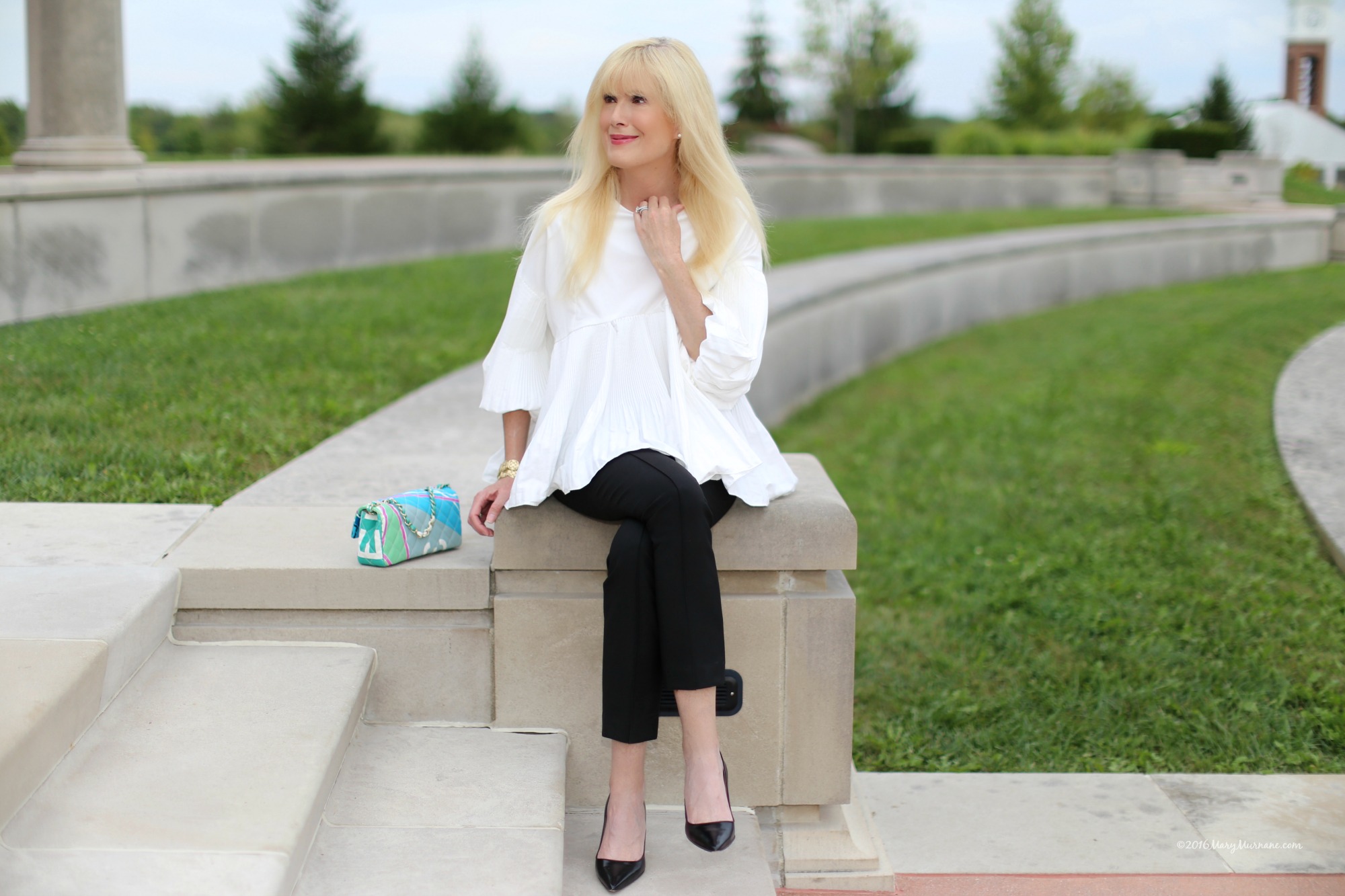 Mary, so stylish! I love this flowy sleeved blouse and really love the skinny pants with this more voluminous top. Classy and chic of course I love the bag with its bright blues and fun print. I would love to try this trend. ( I remember Seinfeld too)