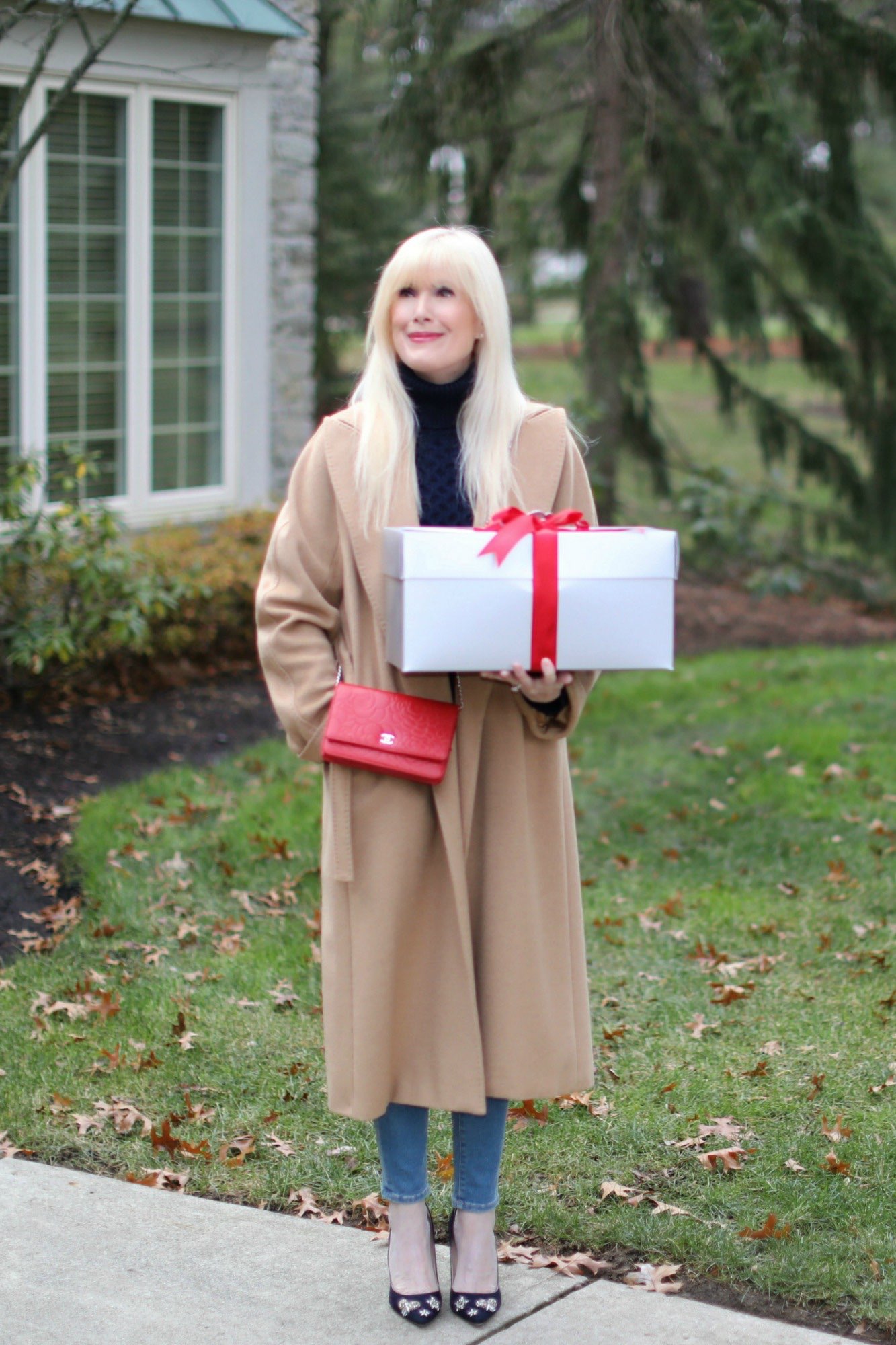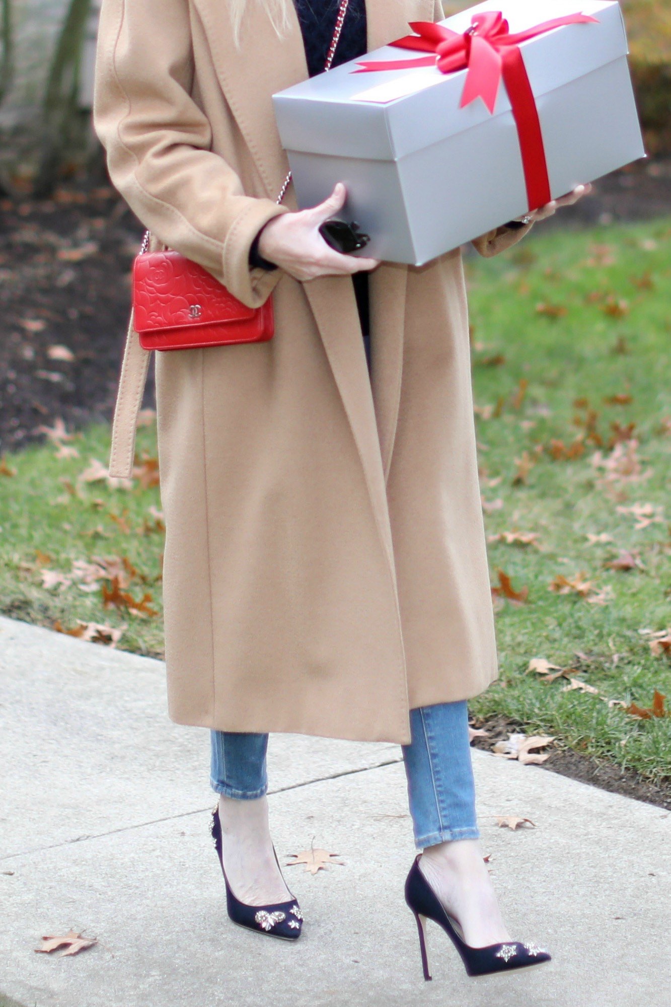 WOW Mary! Loving all of the details here, the gorgeous red bag, the jeweled shoes, and the camel coat a classic. Gorgeous!