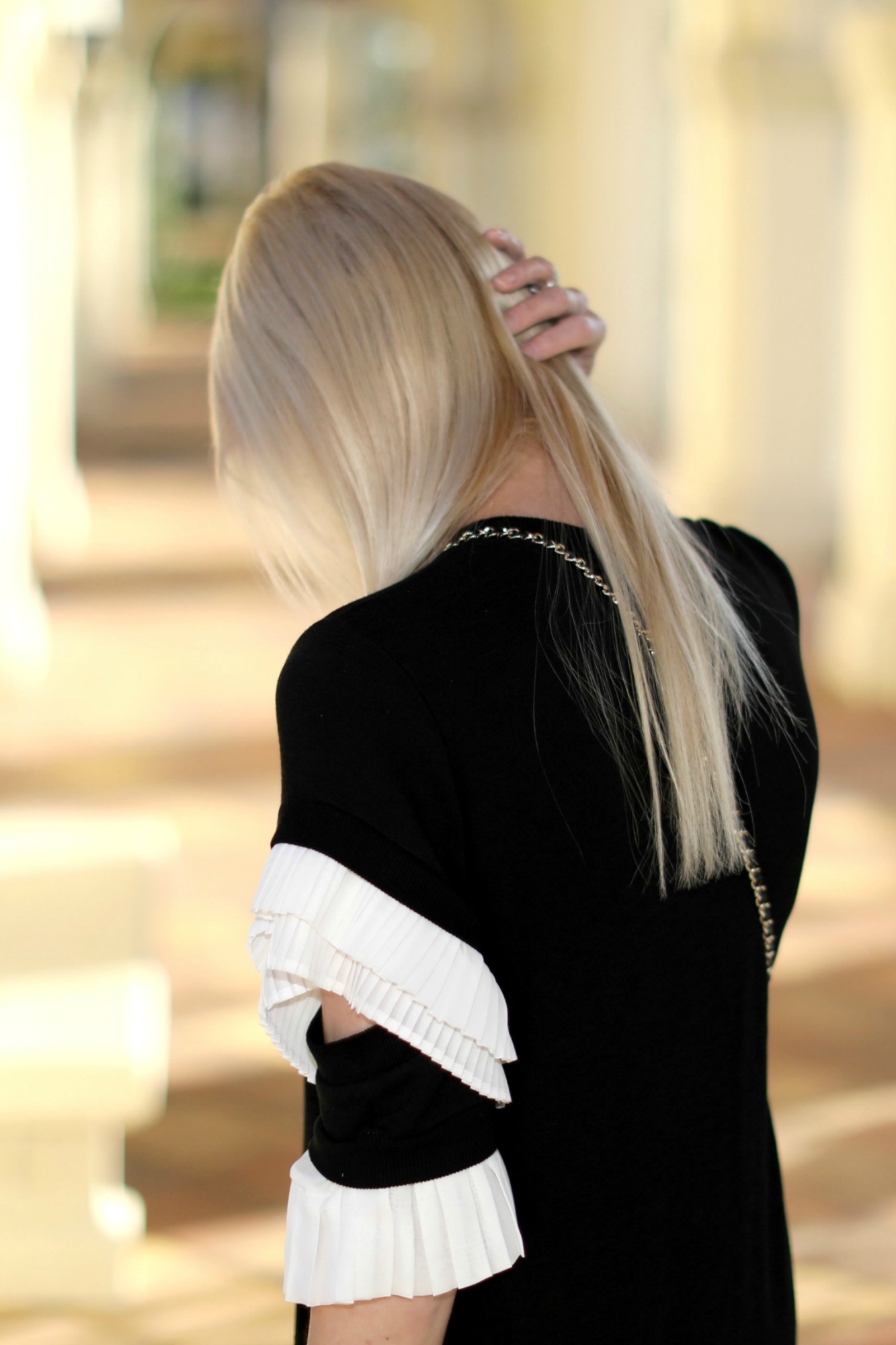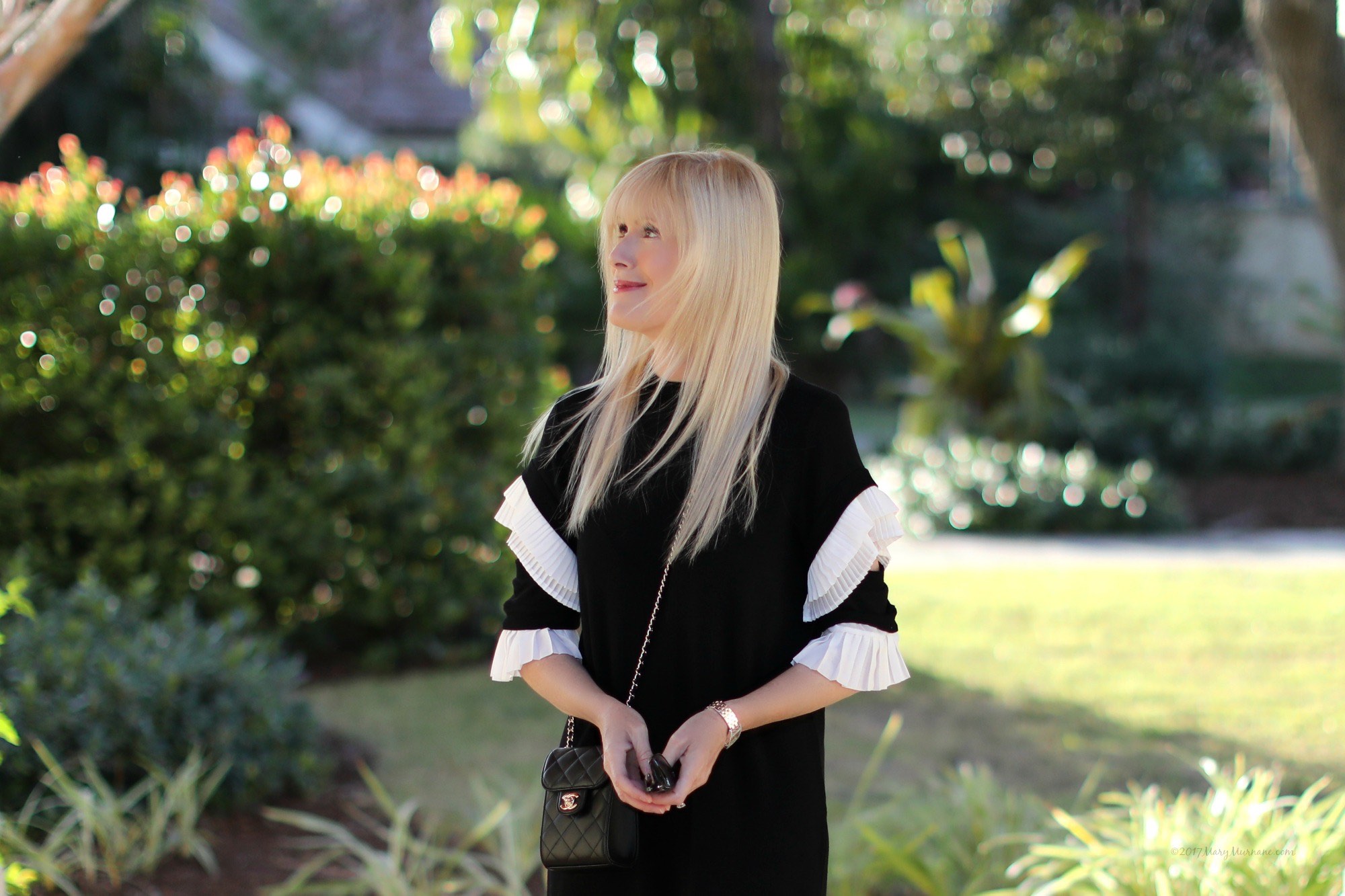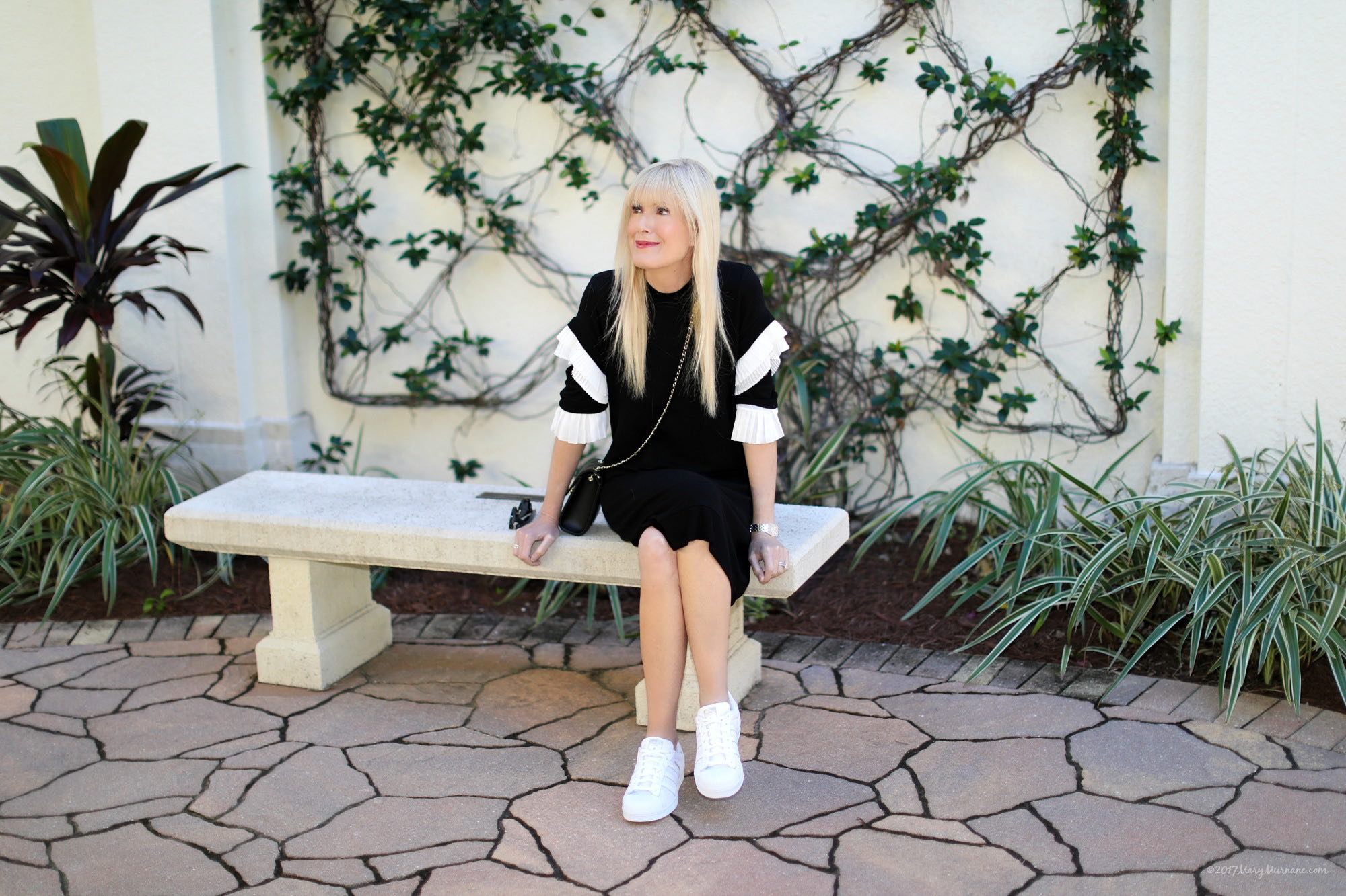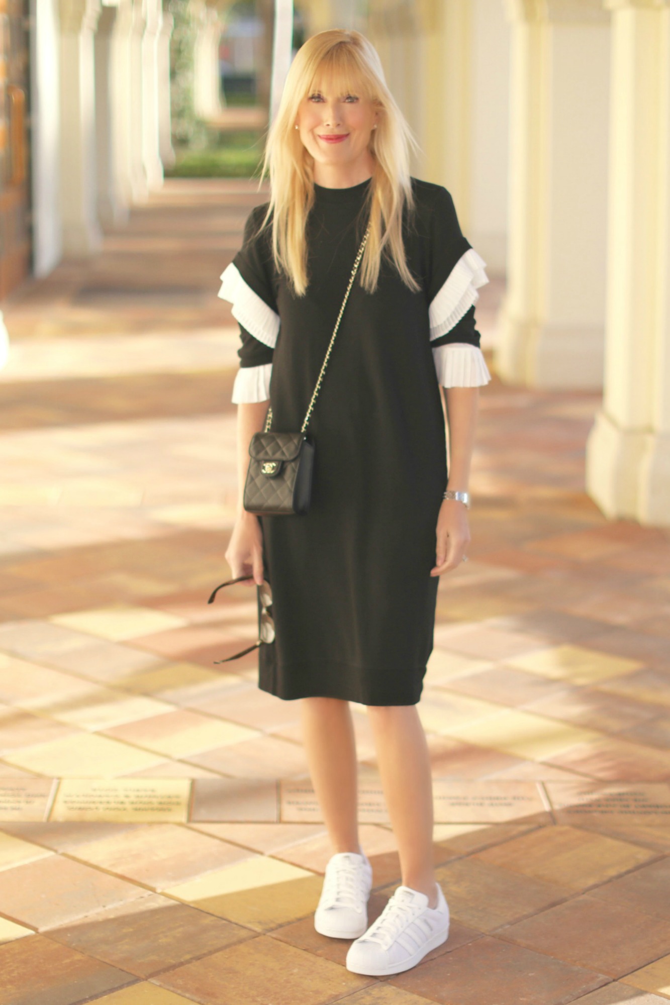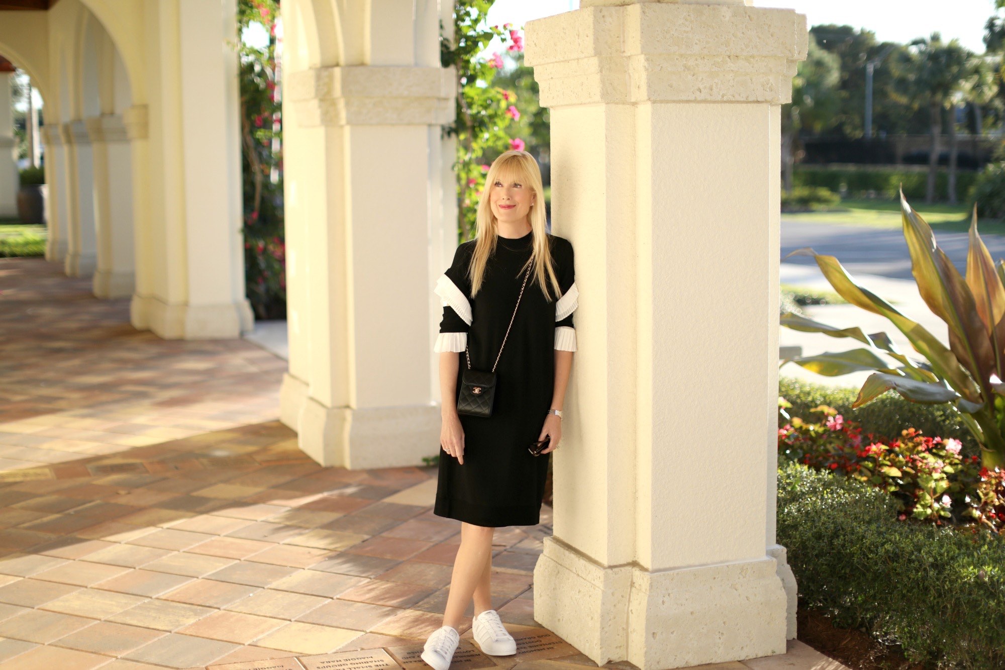 Keeping things casual today, wearing a CLU black stretch jersey dress with some fun and unexpected details. If not for the sleeves on this dress I probably would have passed on it . Those sleeves are definitely what sold me. Adorned with white pleated trim, they give this wardrobe basic a boost that turns it into something really special. Adidas sneakers and a Chanel crossbody bag finish the look and keep things easy, breezy for a day of running around in South Florida.