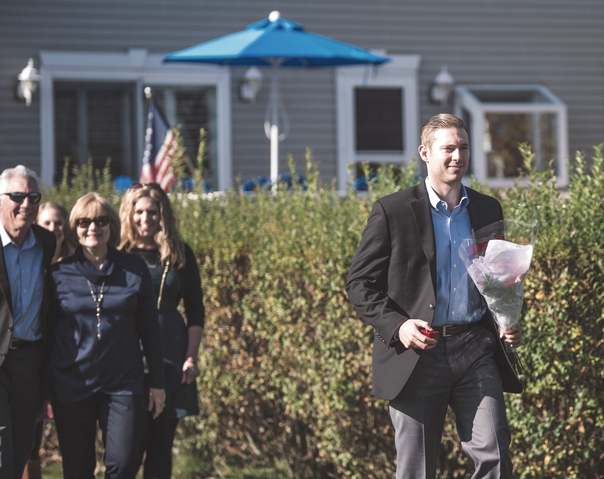 Before I could even comprehend what was happening, Alex suddenly appeared from behind the house and was walking towards me, carrying a bouquet of roses, with his entire family behind him.