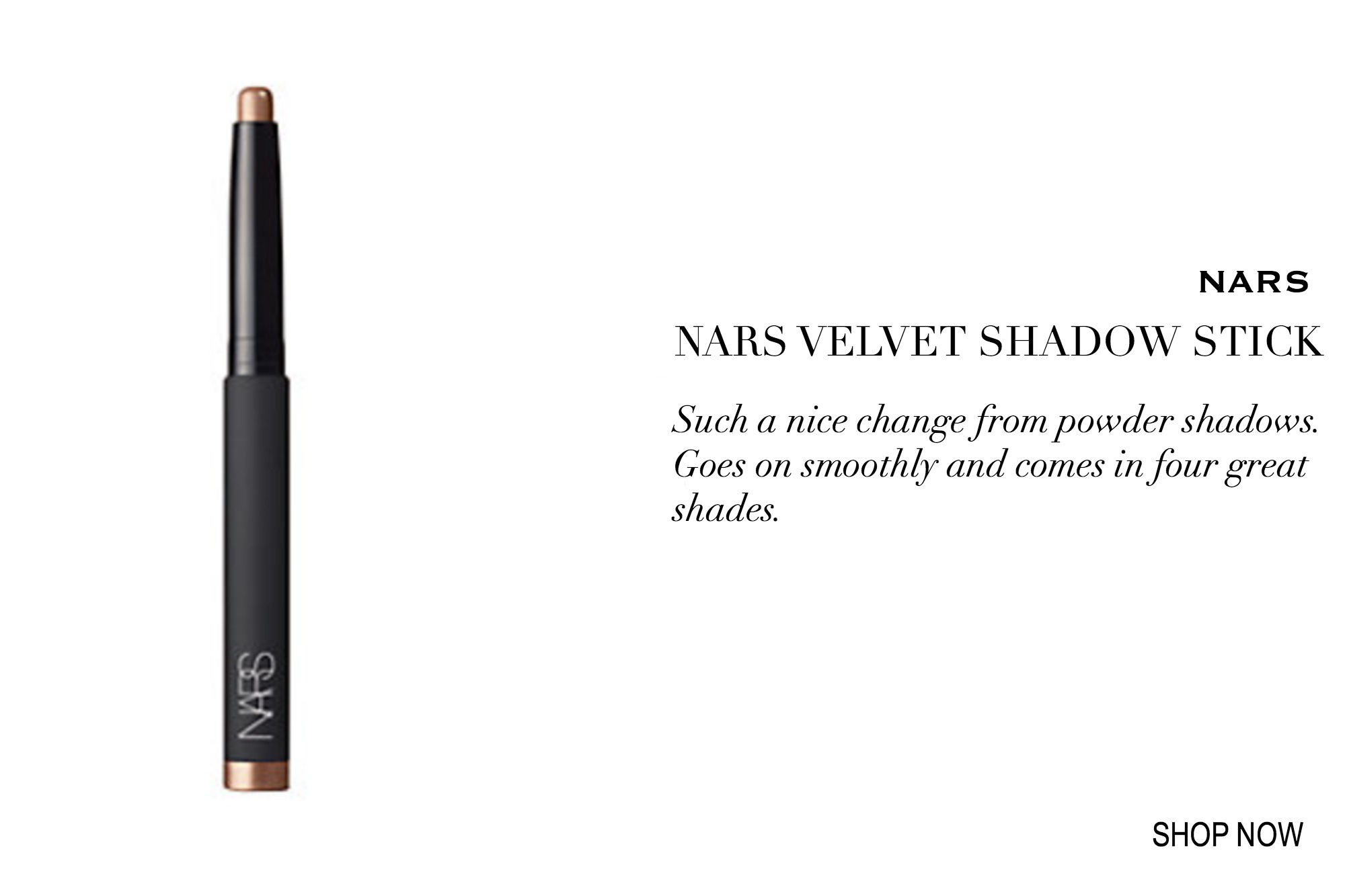 I have been wearing the same eye shadow forever. But recently I’d grown tired of my powder shadow and wanted to try something different. Different in a good way is exactly what I got with NARS Velvet Shadow Stick. I love how easily it glides onto my lids and the color – a purple shade called Usbek – is as pretty as what I used to wear. If I want more depth and color I can easily layer it over my powder shadow but it works equally great on its own.