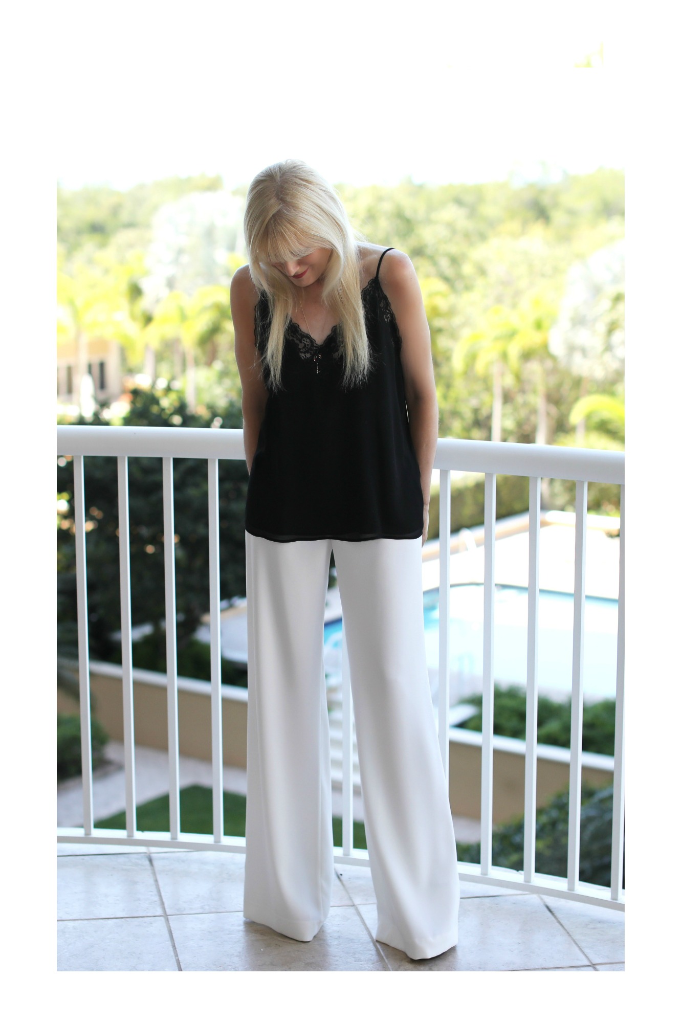 Mary, I love this combo of black and white, the thin strappy lace top with the wide leg white trousers are a beautiful sillouette on you.