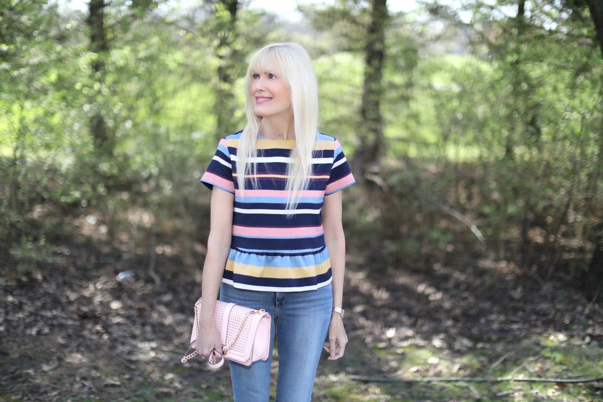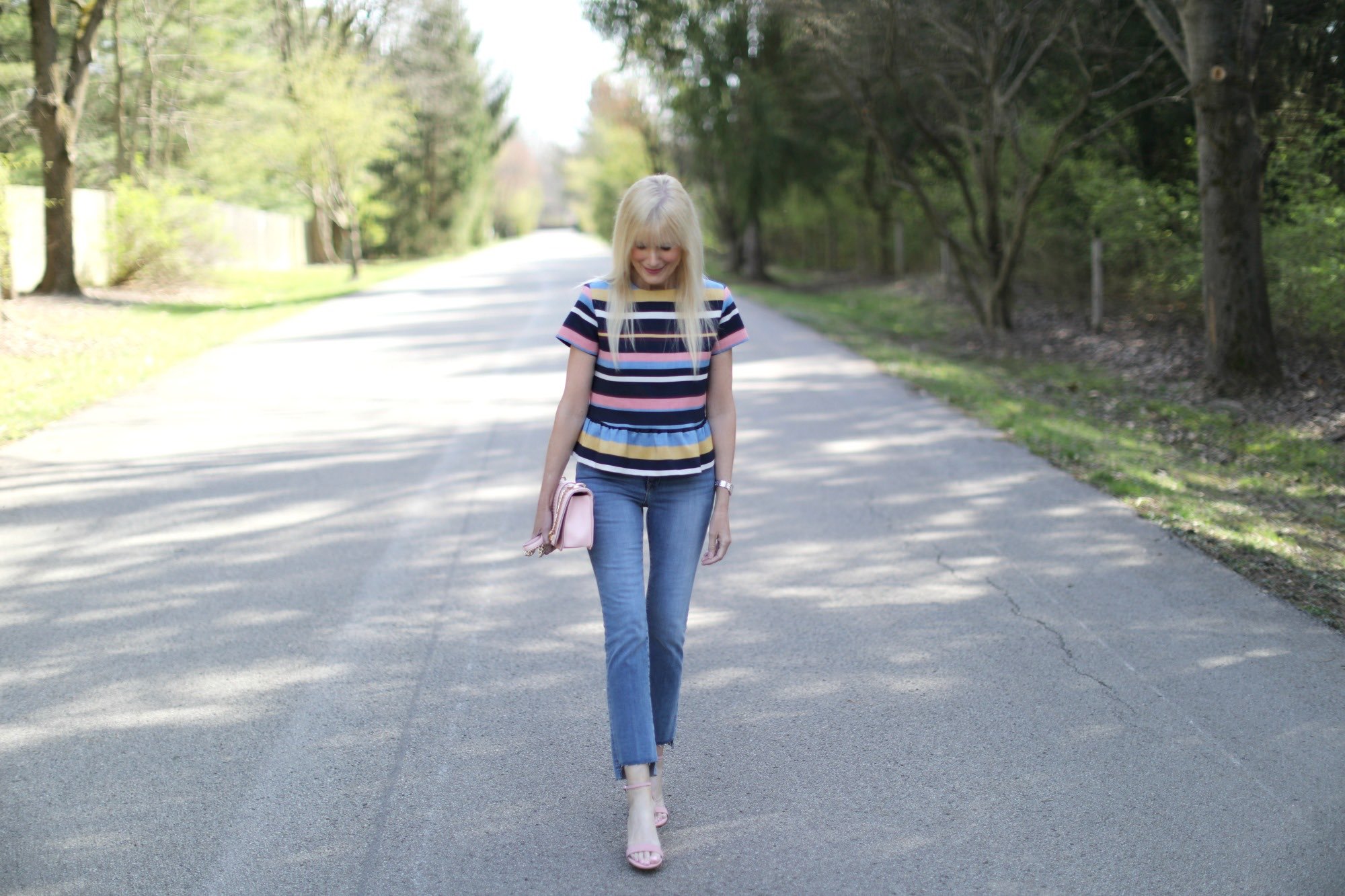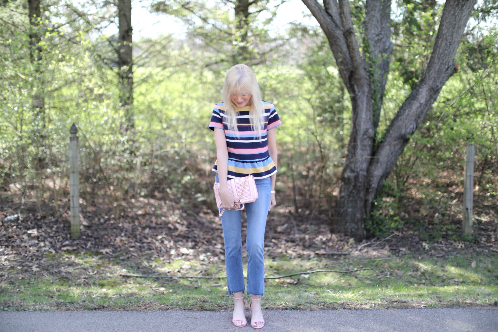 With so much travel on my calendar these days (South Florida, Chicago, Nashville last week and back to South Florida next week) getting dressed needs to be super simple. I love grab and go style that’s easy on the brain but still has an elevated vibe. That’s how I feel about this steal of a peplum top that’s under $80. Absolutely love the stripes and the fit, so much so that I may get it in this print, too. So versatile, I love how it dresses up denim and I also plan on wearing it with some fun navy and white gingham pants. In keeping with that easy formula that’s a must right now, a pair of light and airy blush sandals and a bag in the same color finish off the look perfectly.