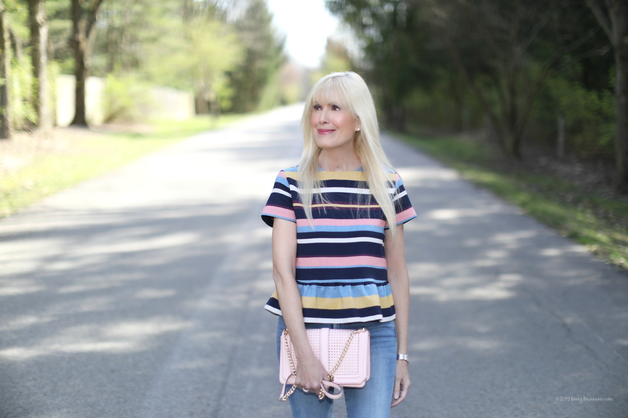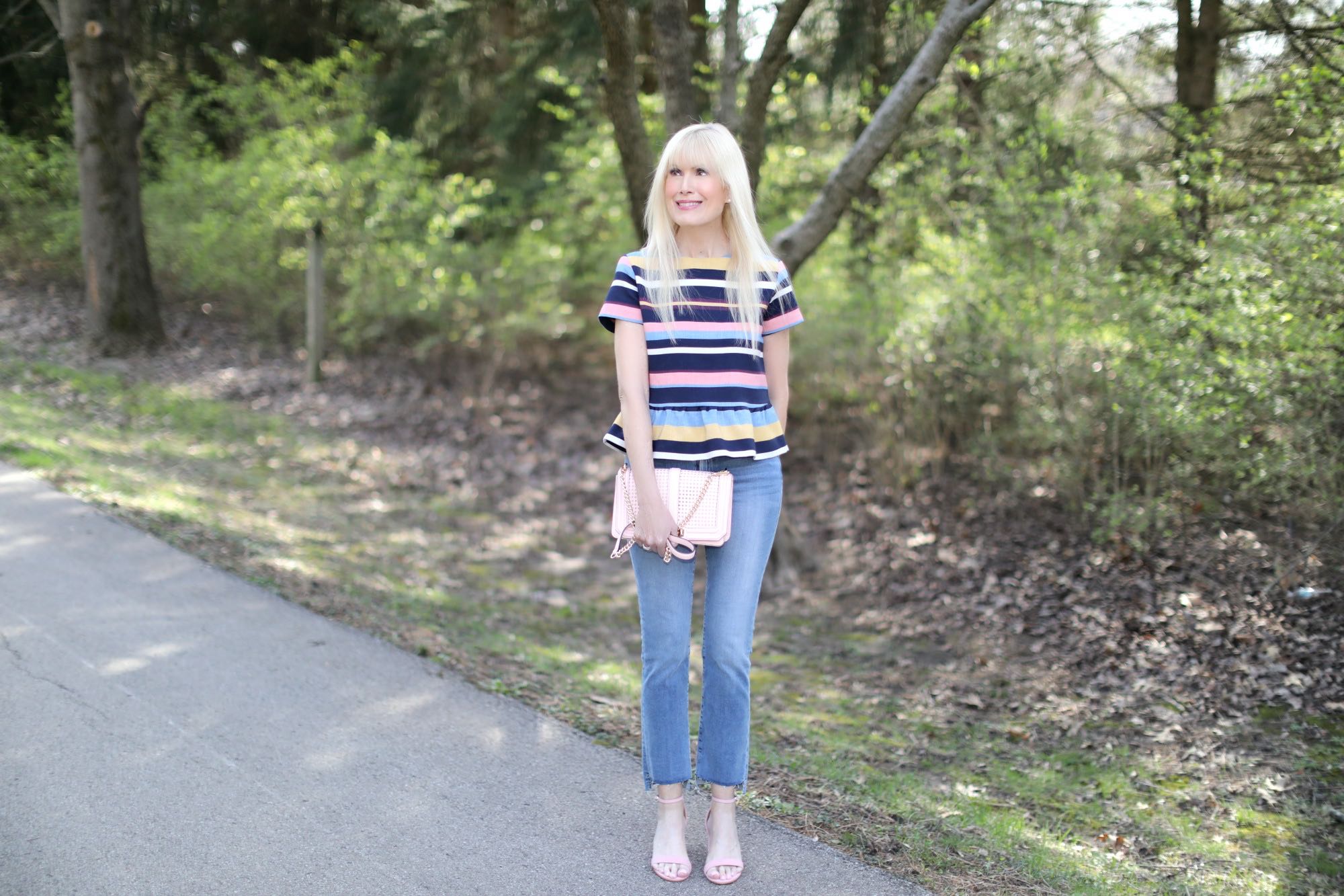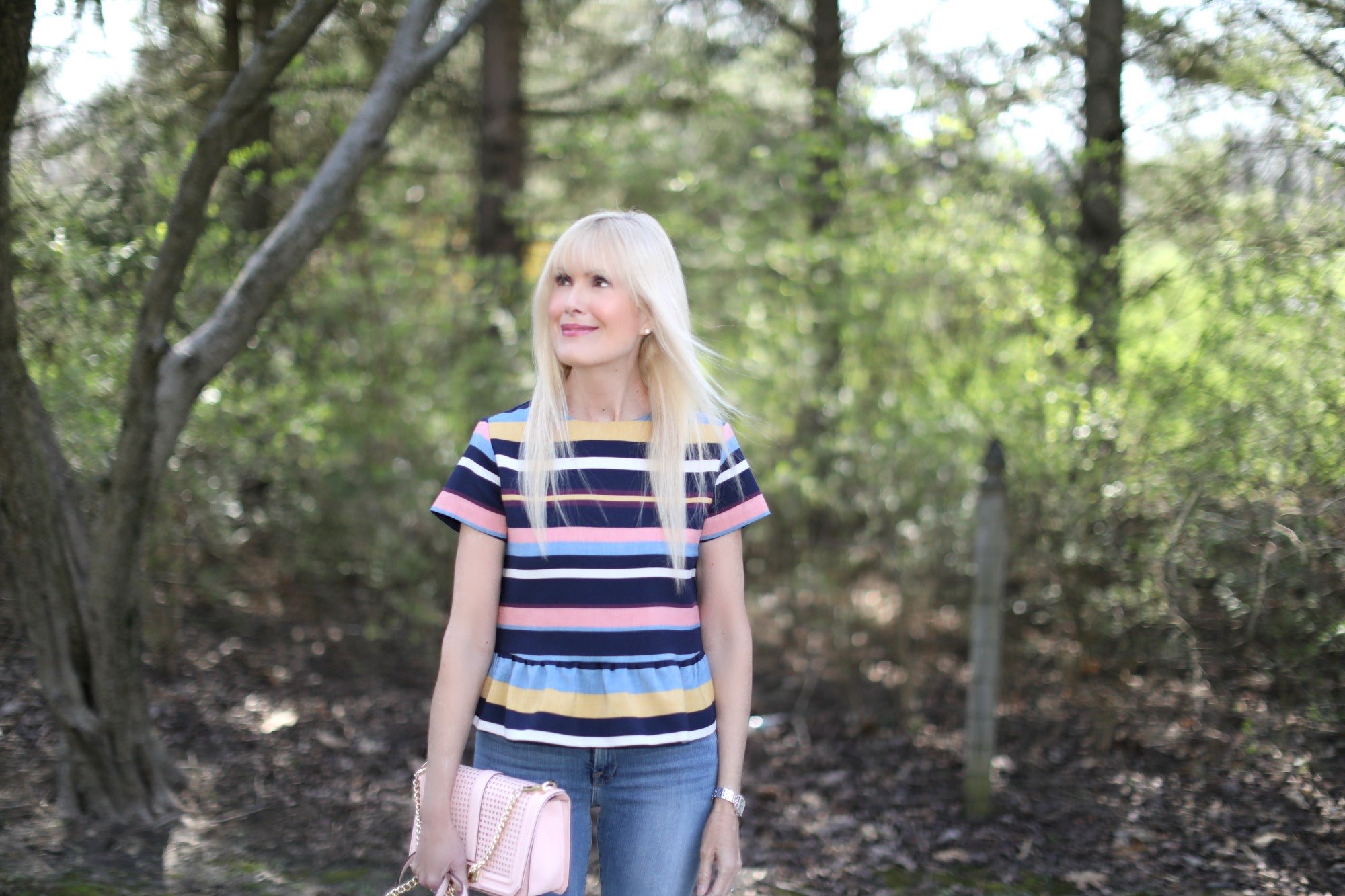 With so much travel on my calendar these days (South Florida, Chicago, Nashville last week and back to South Florida next week) getting dressed needs to be super simple. I love grab and go style that’s easy on the brain but still has an elevated vibe. That’s how I feel about this steal of a peplum top that’s under $80. Absolutely love the stripes and the fit, so much so that I may get it in this print, too. So versatile, I love how it dresses up denim and I also plan on wearing it with some fun navy and white gingham pants. In keeping with that easy formula that’s a must right now, a pair of light and airy blush sandals and a bag in the same color finish off the look perfectly.