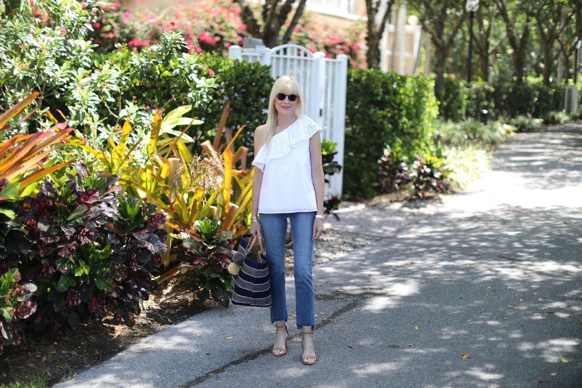 Mary, always impeccable, I love the beautiful detail in this top and agree with the sometime annoyance of the OTS top. I like the one shoulder top as well and the crisp white looks amazing with the jeans and sandals.