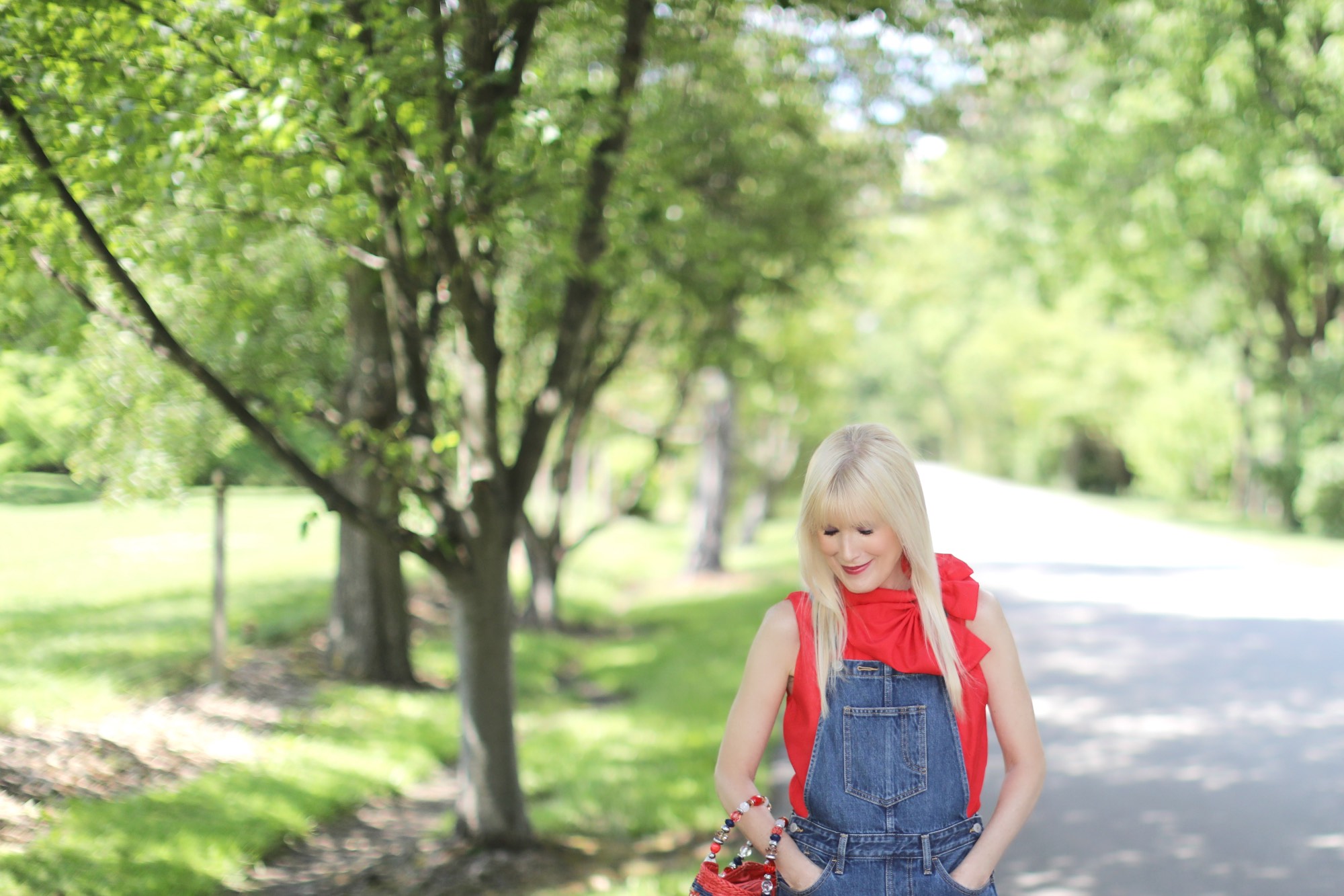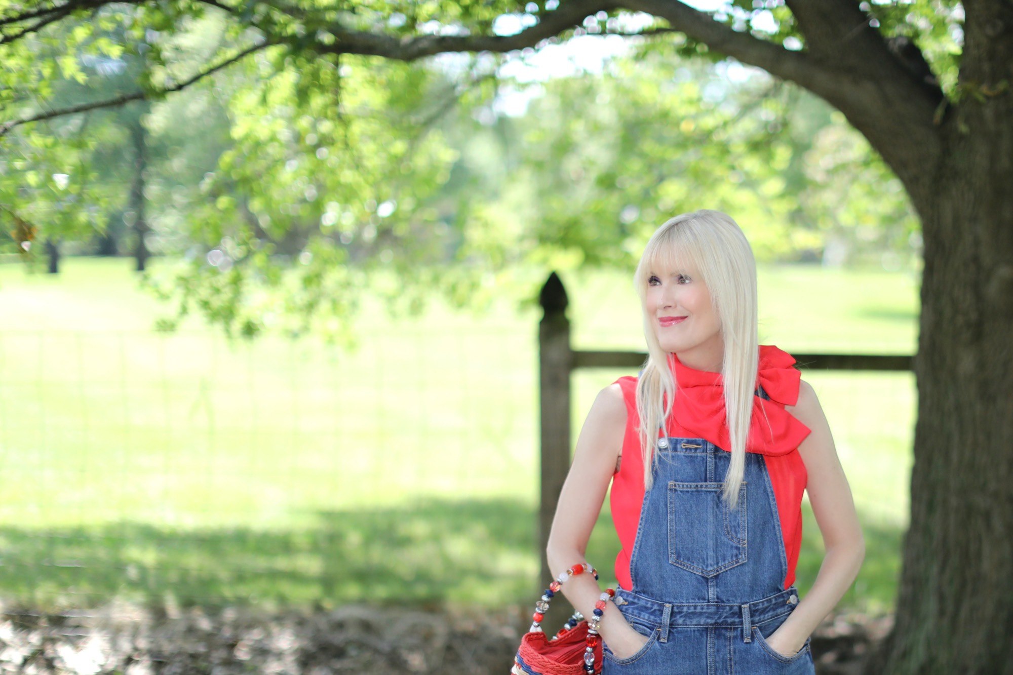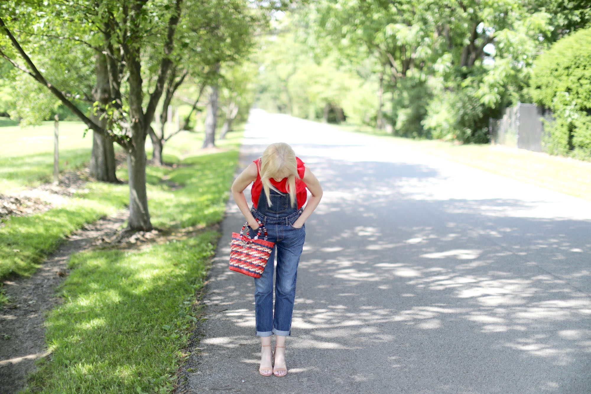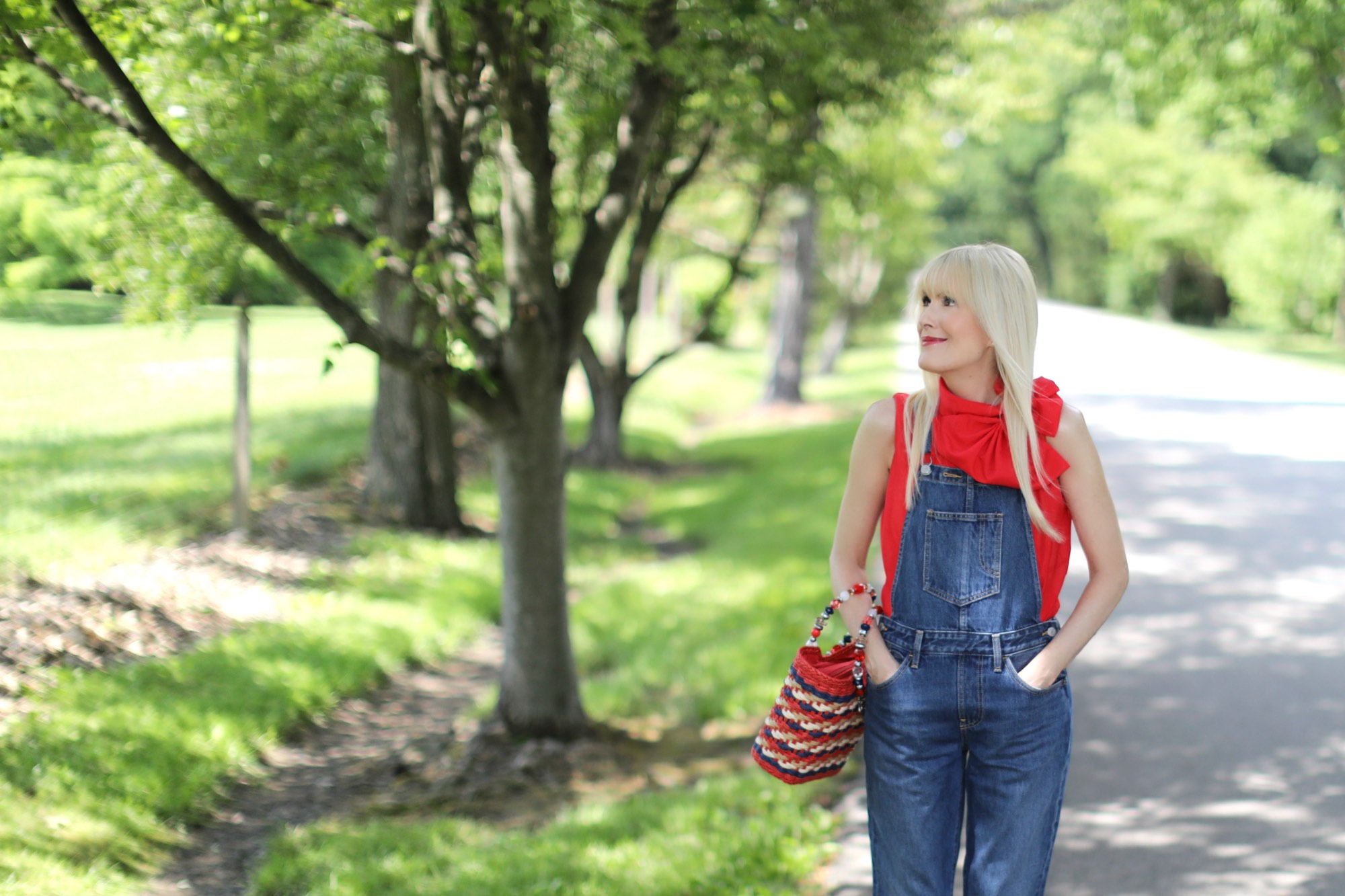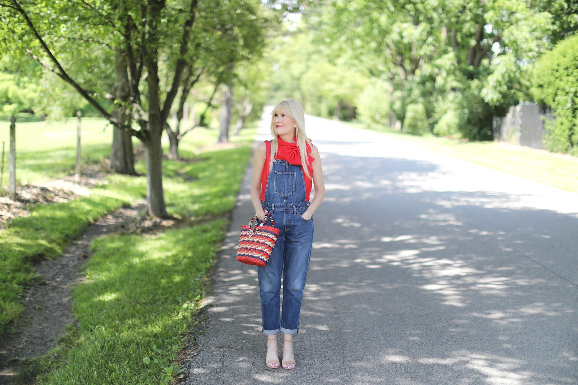 Today marks the eve of what is arguably my favorite holiday. The Fourth of July has it all – an Independence Day celebration packed with parades, parties, concerts in the park, and of course fireworks. Speaking of – we had the most incredible fireworks display in our backyard last night. Absolutely magical! And more to come for the next couple of days. So excited! What to wear to tomorrow’s festivities? Why not a look that is classic Americana? OK, so maybe I do look like I fell into a time machine. After all, I did wear my levi’s overalls into the ground back in the day, as in college days. True, I probably never thought I’d own another pair, but, what can I say, when I spotted these recently I thought, why not? They suddenly seemed on point again and they are definitely perfect for the Fourth. I gave mine a grown-up overhaul by adding a brightly colored bow-neck top, and neutral sandal. My multi-colored straw bag – another nod to the day- finishes off the look with just the right amount of pop.