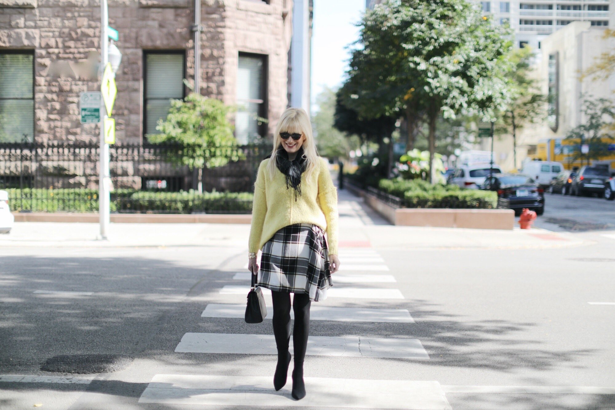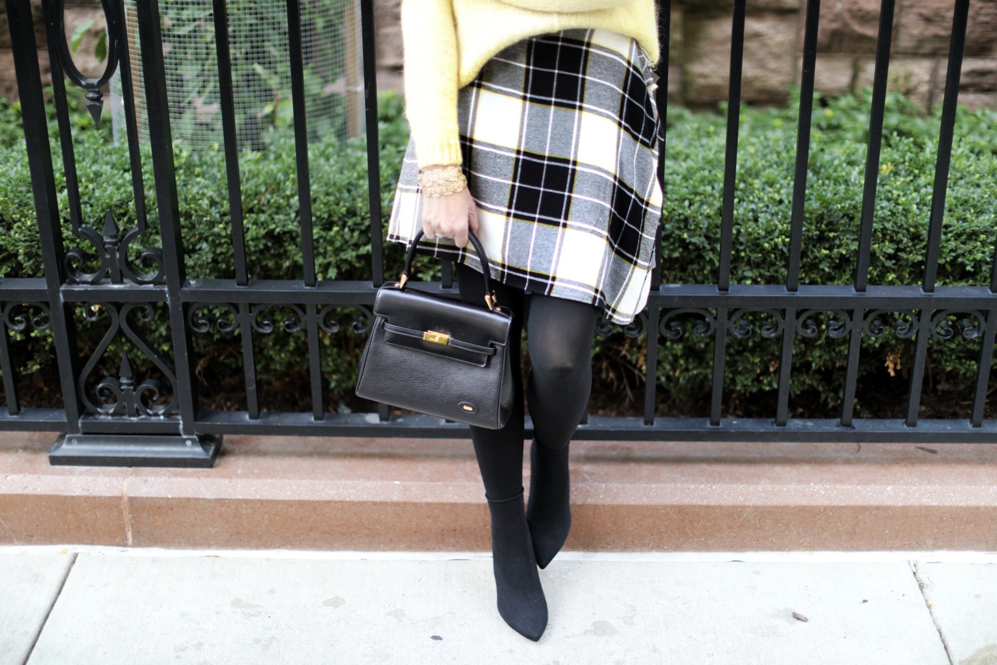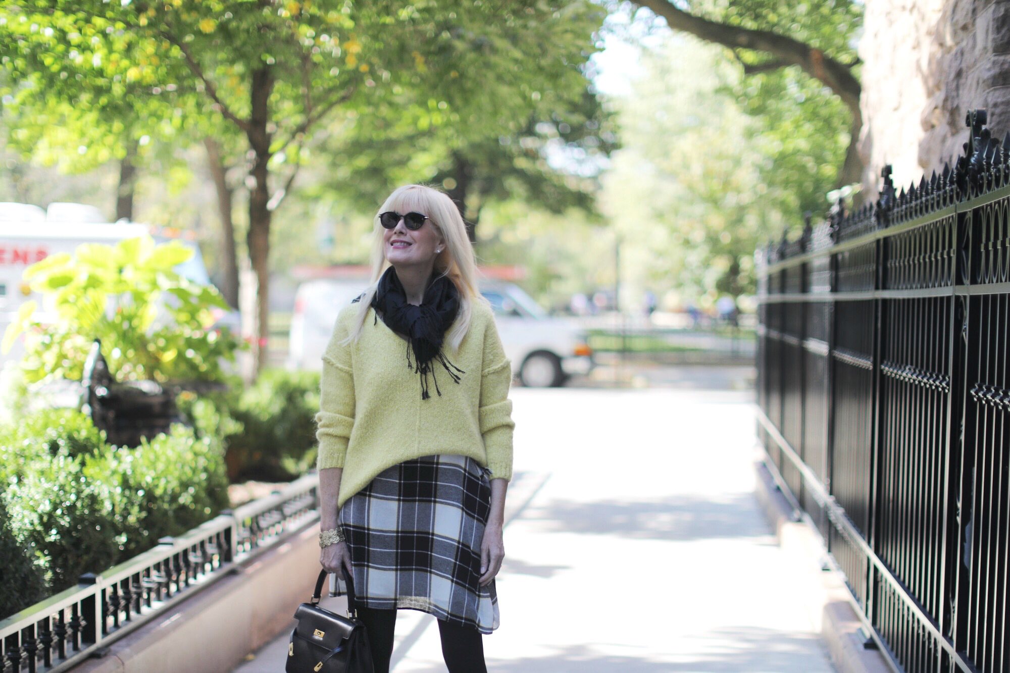 Ever since I was a little girl I’ve loved the color yellow. I have an almost visceral reaction when I see this sunny hue – it just makes me happy allover. Perhaps it’s that it reminds me of of warm summer days and golden rays of light streaming across my bedroom floor. Whatever this sunniest of colors evokes in me, there’s no question, it’s all good. No surprise then, that when I spotted this pretty, chunky yellow knit at Nordstrom recently I was immediately drawn to it. Yellow can be a tricky color for me, but after I tried it on I was convinced this particular shade worked with my complexion. I paired it with a fun retro-plaid skirt that’s currently on sale and added a black scarf, sock booties and my now vintage Bally top handle bag to complete the look.
