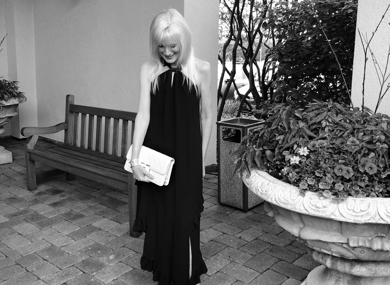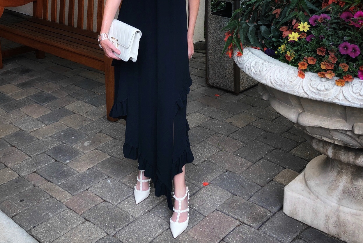 Finding this fabulous Derek Lam dress was a total fluke. I had literally just landed in Chicago this past Friday when I hit the ground running in search of a dress for a Saturday bridal shower. Already late when I headed out, I walked through the door at Barney’s and at first look didn’t see anything that would really work. I tried one granny-gown-ish dress on that made me laugh – too many flowers, too many ruffles, just too much going on for my style aesthetic. (This is it, if you’re interested :) ) As luck would have it though, my sales assistant knocked on the dressing room door just as I was about to come out and handed me this amazing find and as soon as I slipped it on it was love at first sight. It comes with a belt but I liked it better without. It really is the perfect dress for a wedding (it’s the second navy dress I’ve bought in two weeks) but since I needed it for a shower I lightened things up by adding my off-white Chanel bag and the latest addition to my shoe collection – a gorgeous pair of Valentino heels. Love that the studs are off-white too! Much more subtle than the gold and they really brought the whole look together. Love when that happens so serendipitously :)