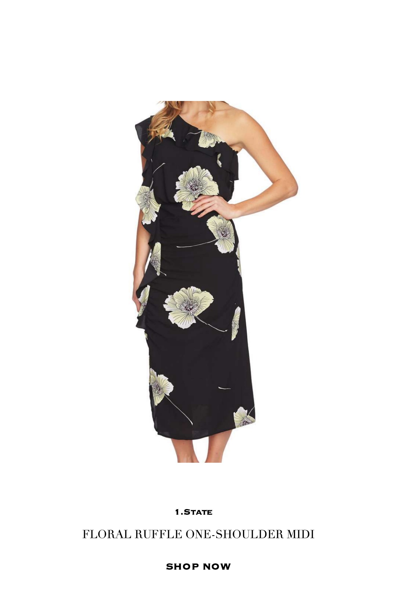 It’s the sweetest little print around and this season expect to see plenty of it. Pretty spring bouquets are blossoming on dresses, tops, coats and shoes, with large-print florals, like the motif on my dress, leading the petaled pack. Love that the flowers are set against black. Makes for an elegant yet fun date night dress. The ruffle front and one-shoulder silhouette are also a nice touch as is the price! This dress is a steal and is currently on sale for under $100! I accessorized with black drop earrings, my Cult Gaia Ark Bag and a pair Stuart Weitzman strappy sandals but a simple clutch and block heel mules would look equally great.