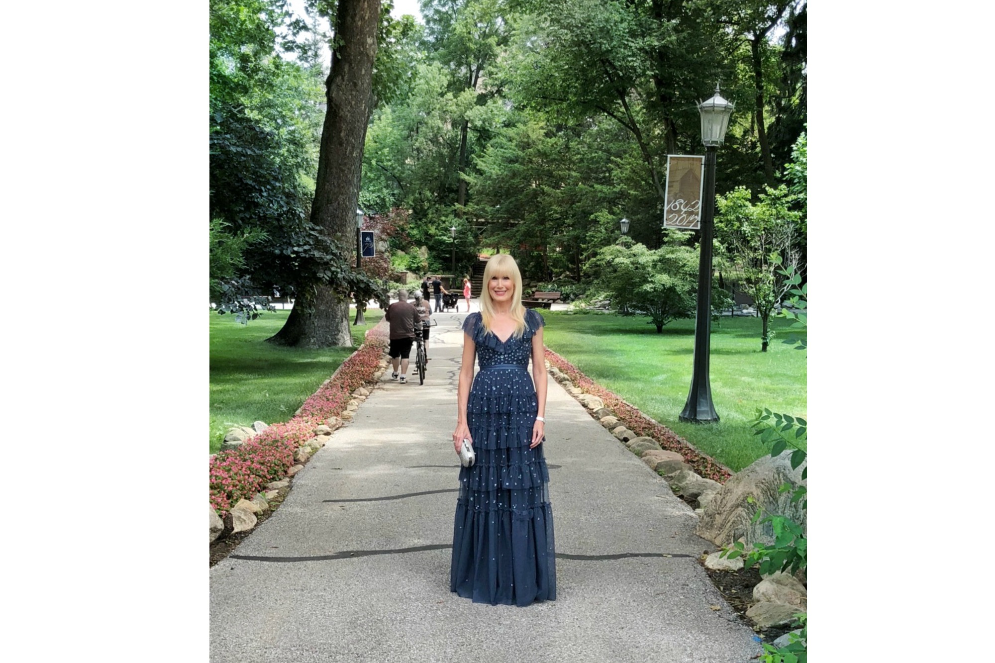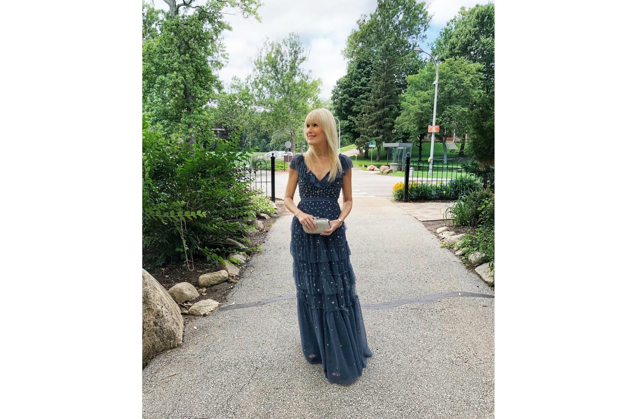 My dress for the big event was a last minute substitution. The dress I had planned on wearing to the Saturday ceremony and evening reception arrived from the West Coast still in need of additional alterations. With no time left to have the dress fixed I turned to one of my favorite online retailers- Moda Operandi – and found a gorgeous dusty indigo gown that saved the day. While it’s no longer available at MO I was able to track this beauty down for you here and can’t say enough great things about it! It’s by Needle & Thread, a line I have never worn before but I will definitely wear again. The floaty confection replete with starburst embellishments fit like it was custom made just for me. Such a nice surprise! Nothing beats a dress that doesn’t need alterations, don’t you agree?!